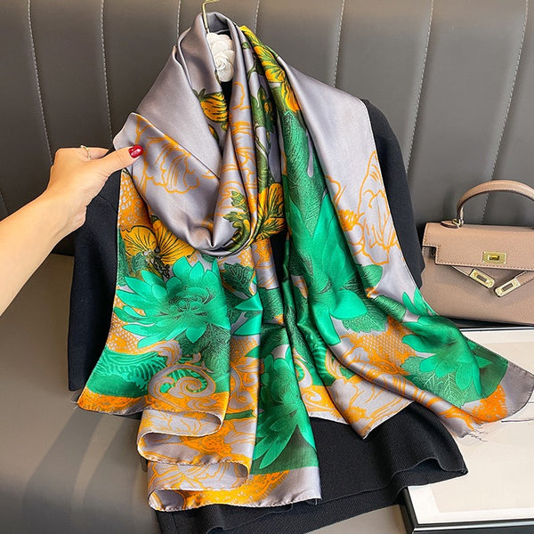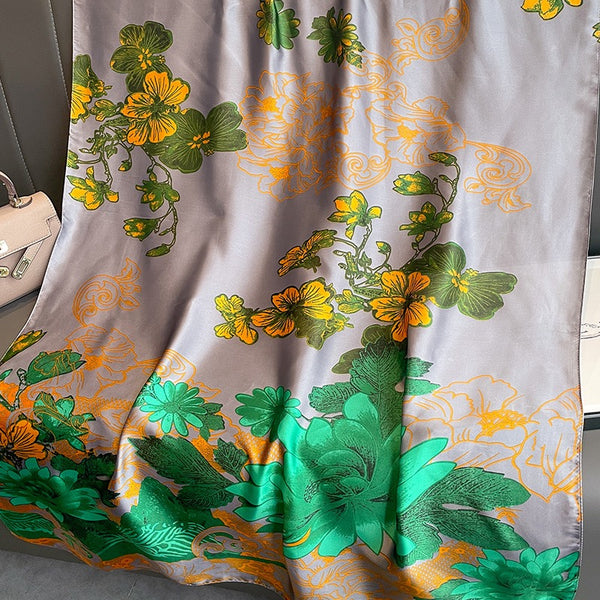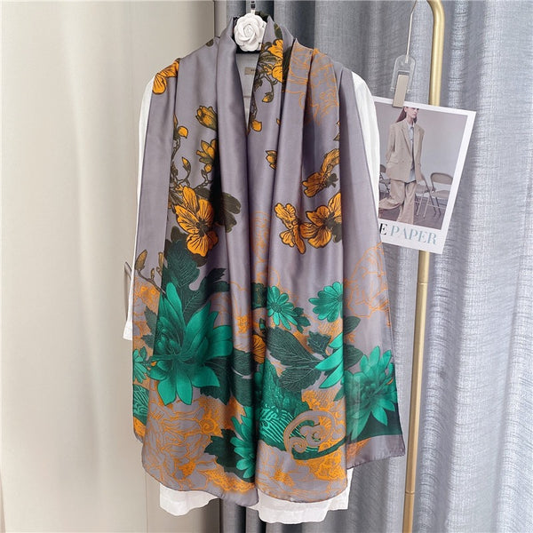 Against the subtle greyish purple, the lively orange flowers and vibrant green leaves evoke the feeling of a refreshing sunrise. This scarf is a work of art that captures the essence of dawn's promise.