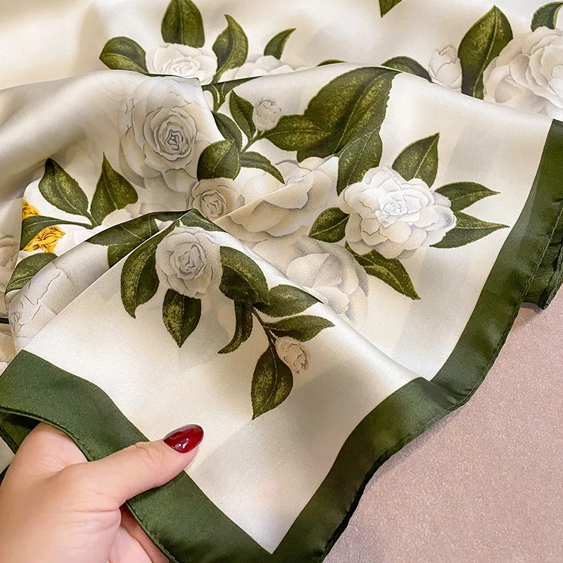 The scarf features delicate white flowers and lush green leaves that dance across the white background, creating a serene and captivating scene. Adding to the scarf's beauty and allure are the gold chains that add a touch of elegance and sophistication to the overall design.