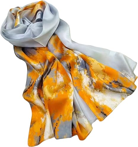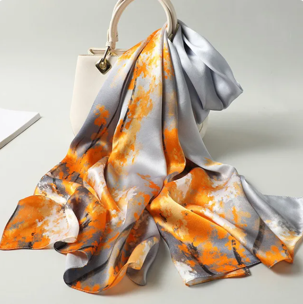 A blaze of autumnal splendor ignites upon this scarf's silver canvas, where fiery orange patterns dance like flames amidst smoky gray tones, evoking the warmth and vibrancy of the fall season in every flicker of color.