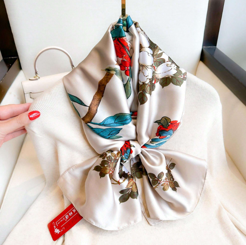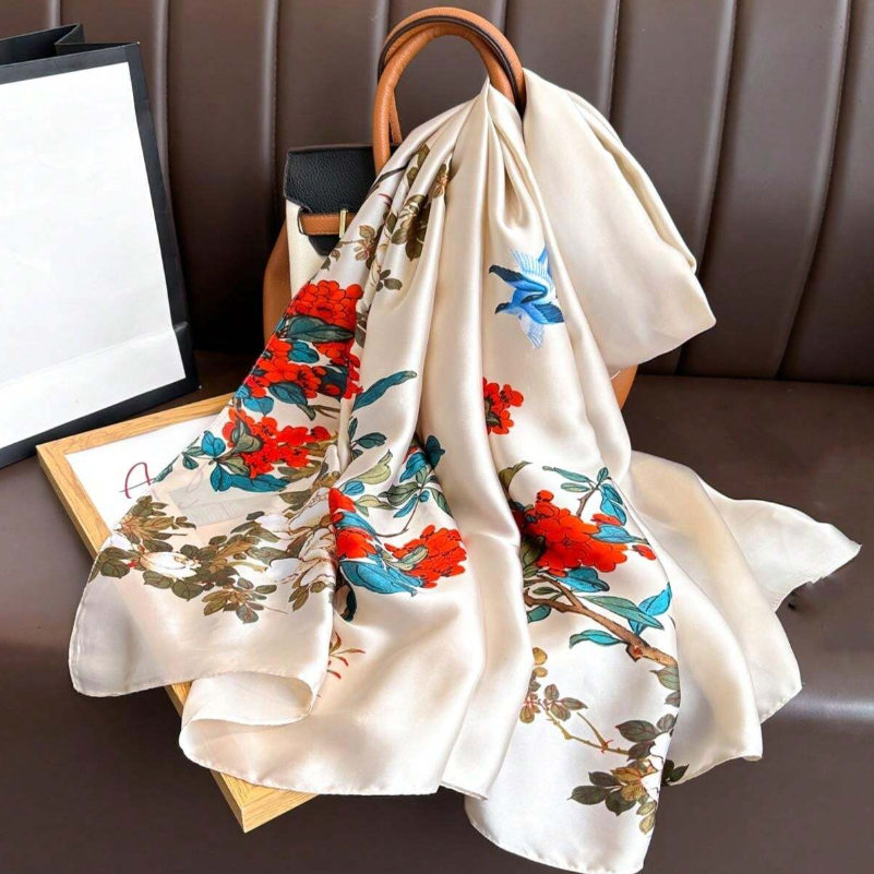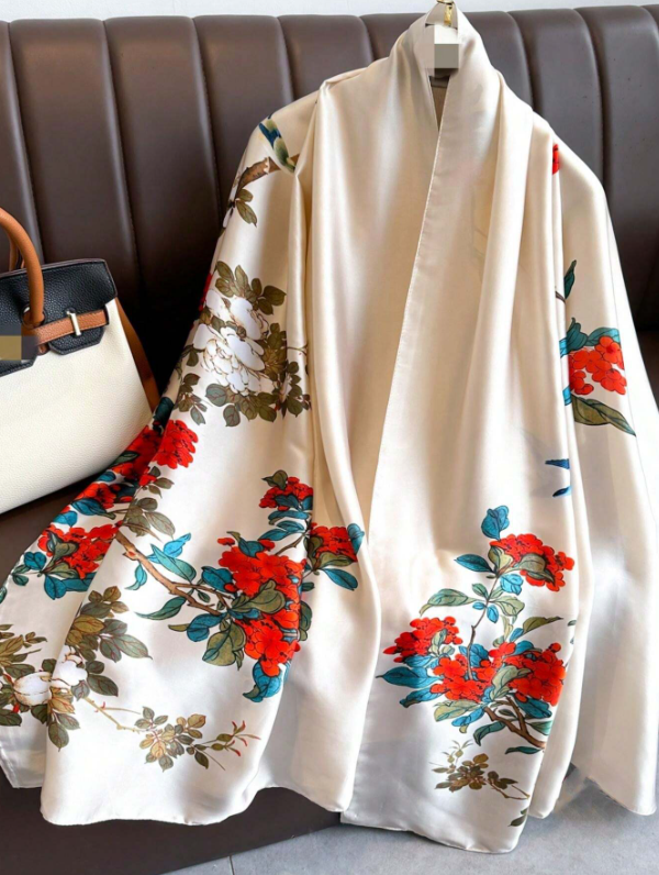 The off-white canvas, adorned with vibrant red flowers, blue leaves, and intertwining stems, becomes a luminescent garden. This scarf is a radiant bloom, a celebration of nature's luminosity.
