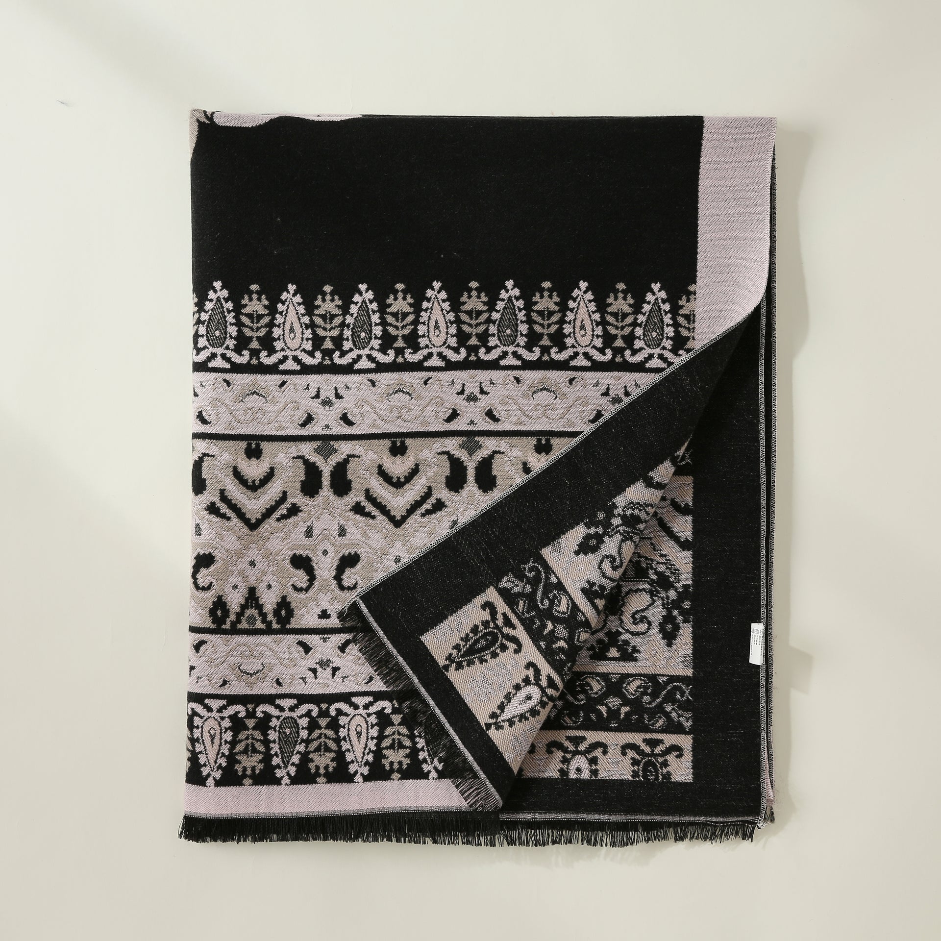 Indulge in timeless elegance with 'Nocturne,' a scarf adorned with intricate patterns in black and soft gray. Its rich design and cozy texture make it the perfect statement piece for adding sophistication to any outfit.