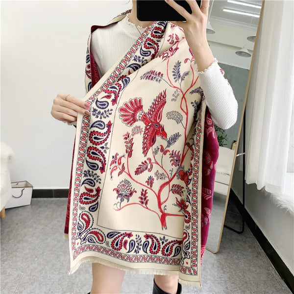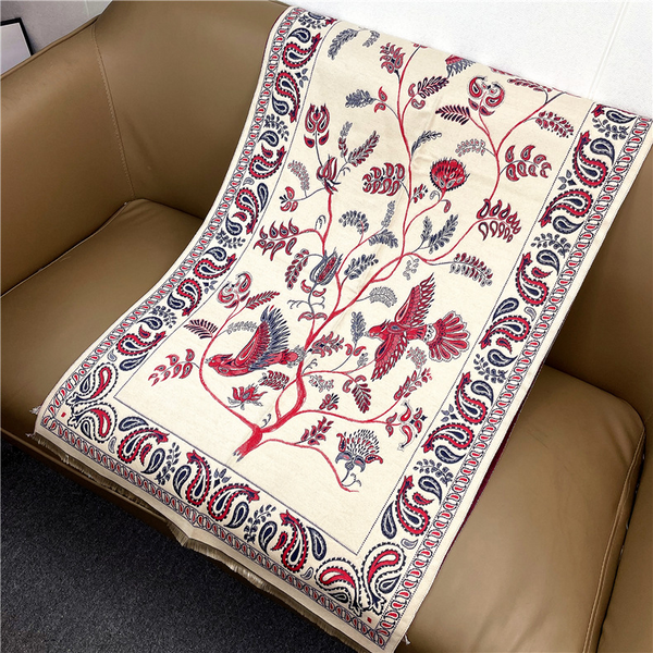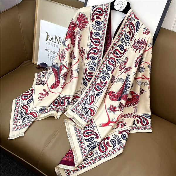 Against the creamy canvas, intricate red motifs of flowers, branches, and birds reflect the artistry of Ottoman textiles. The opulent trim adds a note of grandeur, making this scarf a regal testament to cultural richness and elegance.
