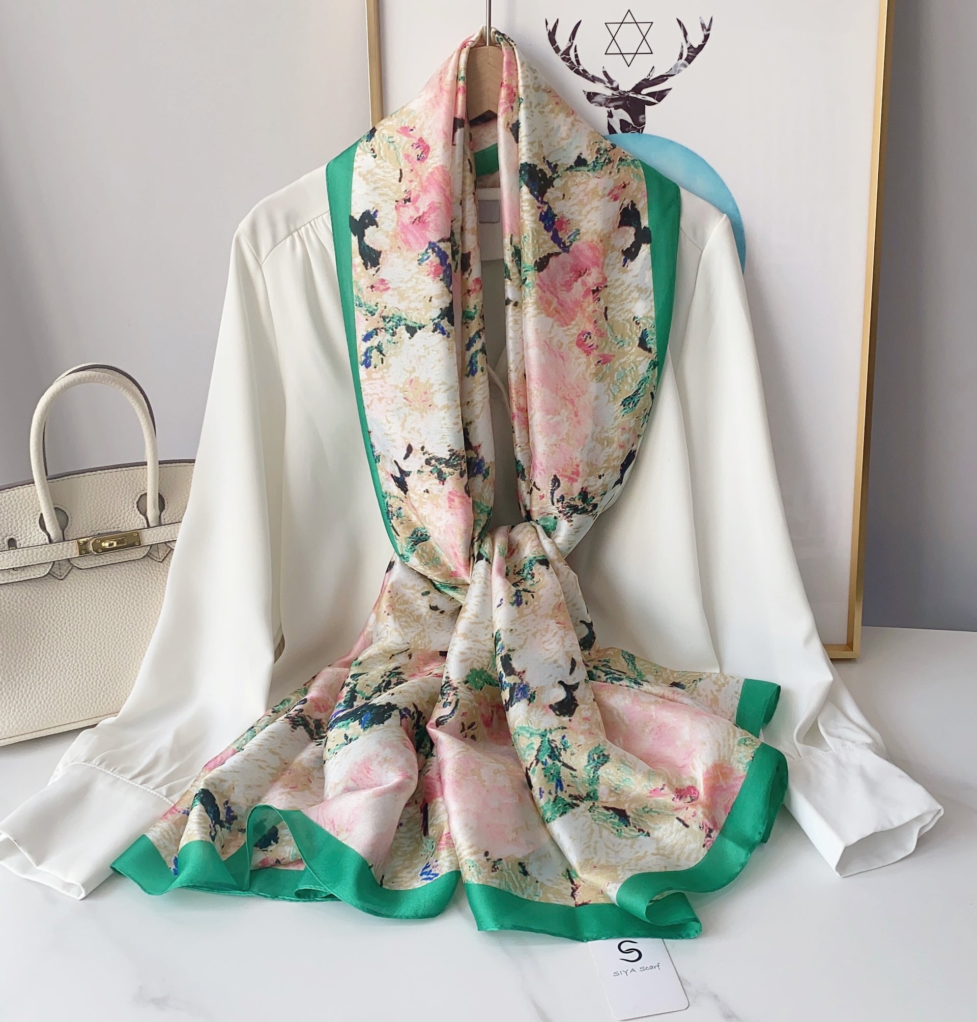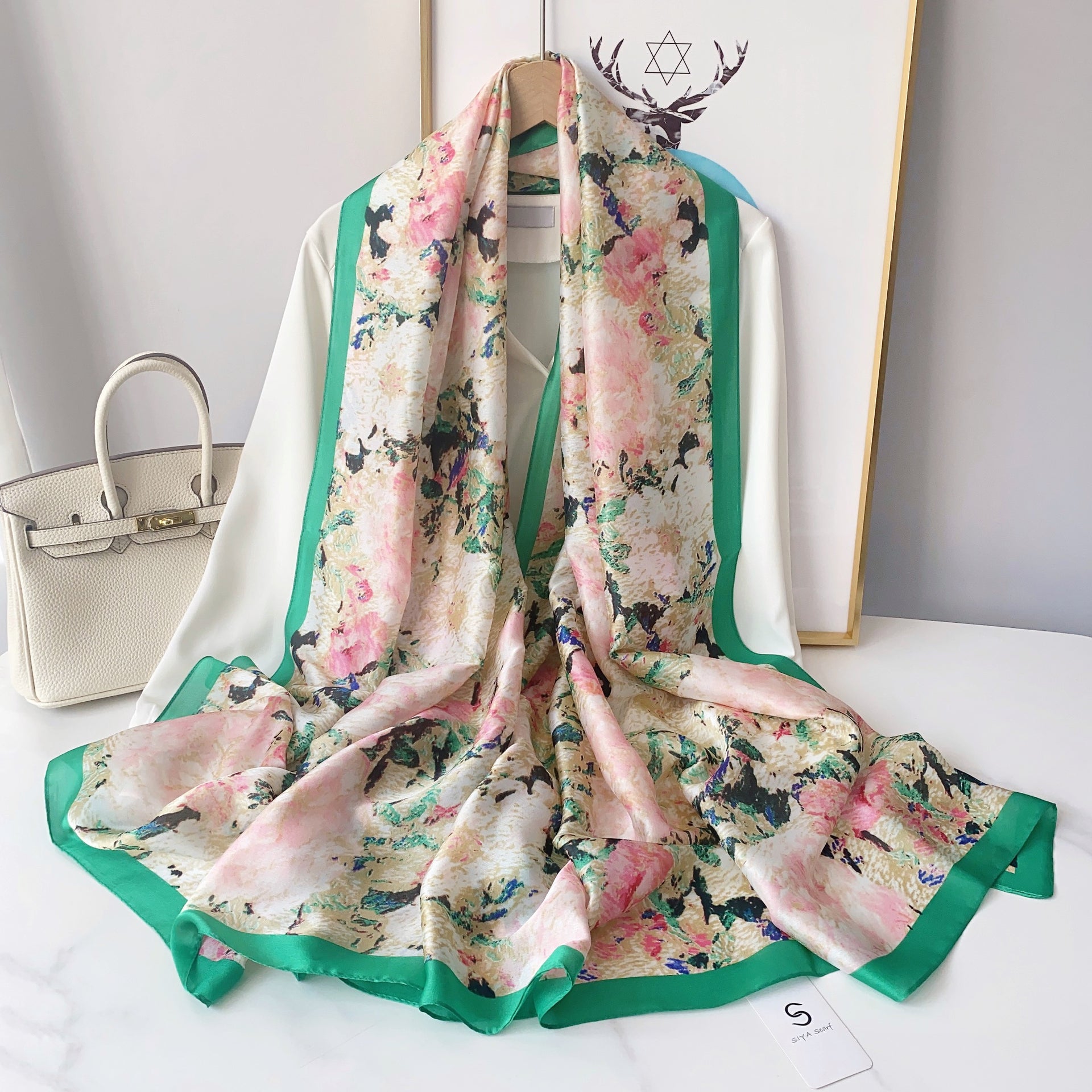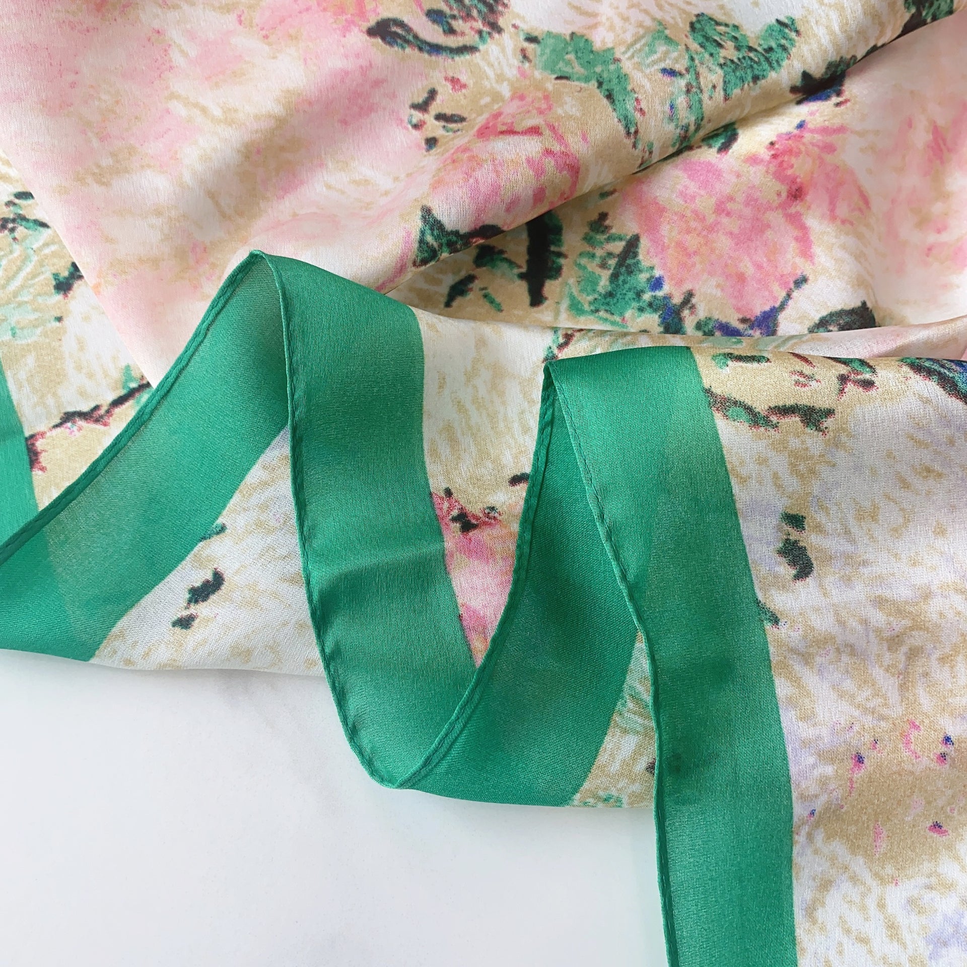 A celebration of nature's artistry, Botanic Dream captures the soft allure of a flourishing garden with its blend of delicate pink blossoms and rich emerald borders. This scarf’s elegant design is reminiscent of a painter’s brushstrokes, creating an impressionist masterpiece that whispers sophistication.